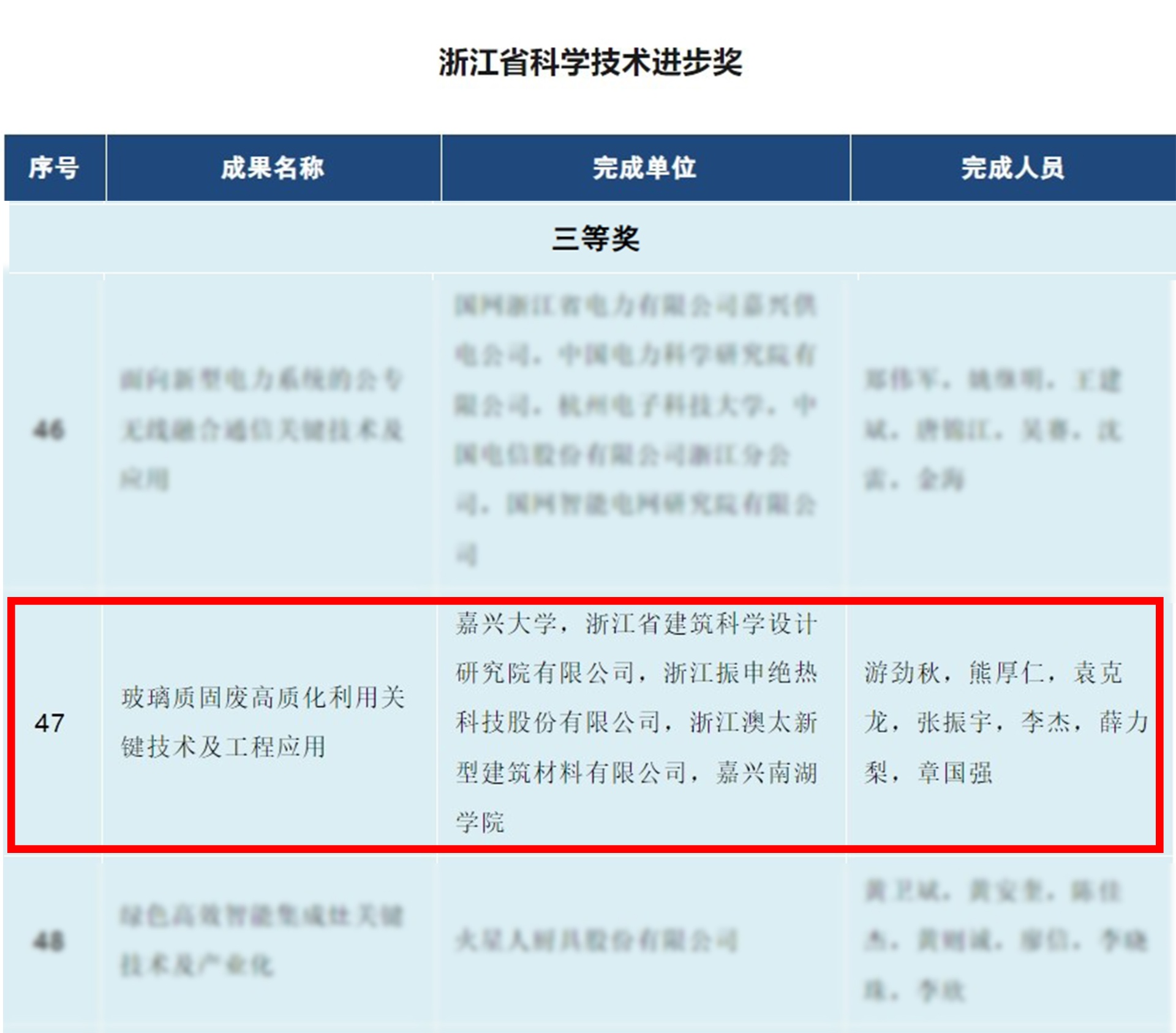 近日,加快設創新浙江因地制宜發展新質生產力動員部署會暨全省科學技術獎勵大會在杭州舉行,浙江振申絕熱科技股份有限公司《玻璃質固廢高質化利用關鍵技術及工程應用》項目榮獲科學技術進步獎三等獎。這是公司連續第三年獲得該獎項。